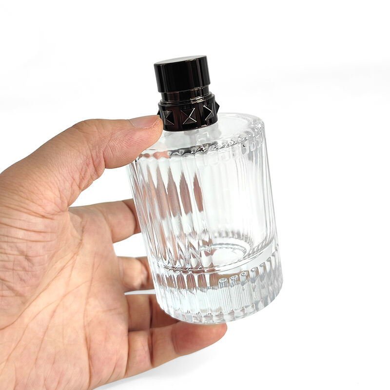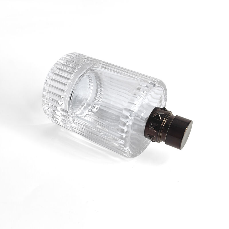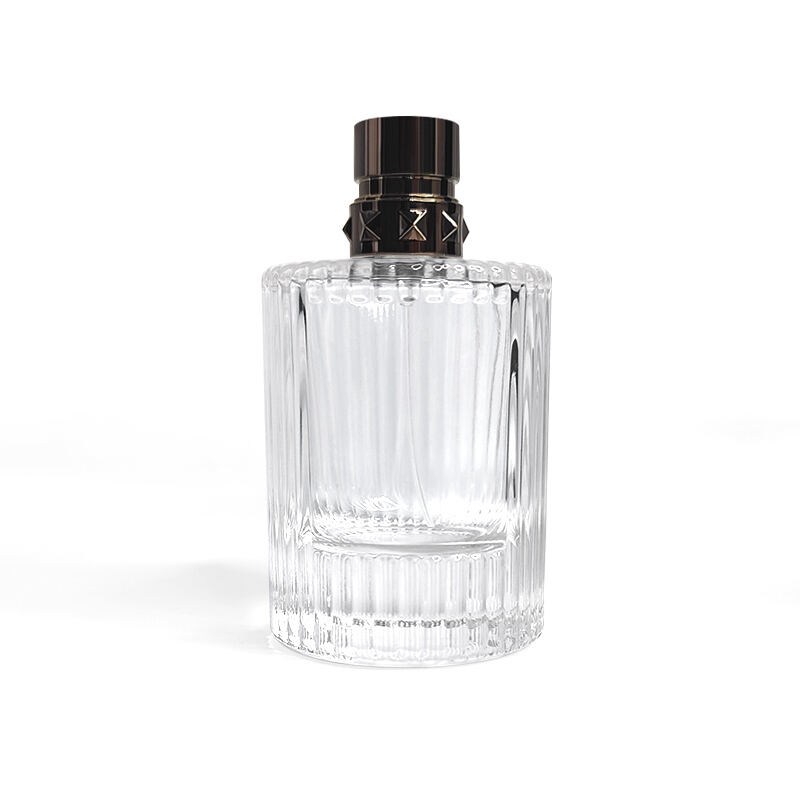 This perfume bottle provides 50ml and 100ml dual capacity options. It is a popular product under the search terms of "vertical perfume bottle" and "textured glass fragrance container" in the perfume industry. The bottle body is based on the high permeability glass, and adopts the overall vertical ridge design: the fine three-dimensional pattern covers the bottle body, which not only strengthens the transparent texture of the glass through light and shadow refraction, but also makes the regular contour with delicate edges and corners, which meets the demand of "atmospheric perfume bottle" and "high-end texture fragrance packaging", and adapts to the brand positioning of mature flavors such as woodiness and fragrance.