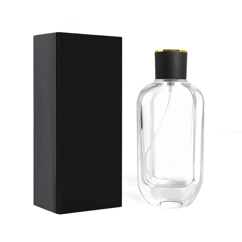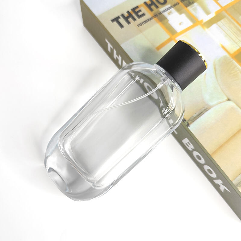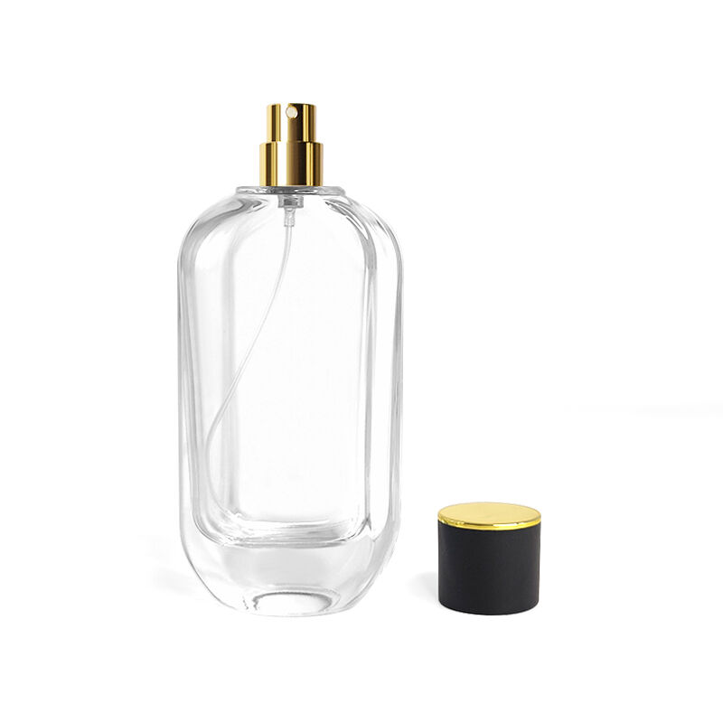 This glass perfume bottle interprets elegant texture with minimal geometric aesthetics. The transparent glass material is crystal clear, outlining a unique three-dimensional contour. The capacity options of 50ml and 100ml meet different usage scenarios. The black bottle cap with gold trim is exquisite and elegant, and can be adapted to all kinds of perfume caps. Whether it is fresh fruit, fragrant flowers or deep wood fragrance, it can perfectly match with it, so that each perfume has its own exquisite container, showing taste and style.